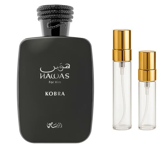 Hawas Kobra de Rasasi es una fragancia de la familia olfativa Oriental Amaderada para Hombres. Esta fragrancia es nueva. Hawas Kobra se lanzó en 2025. Las Notas de Salida son jengibre, bergamota y naranja tangerina; las Notas de Corazón son canela, neroli y té verde; las Notas de Fondo son almizcle, notas amaderadas y ámbar.