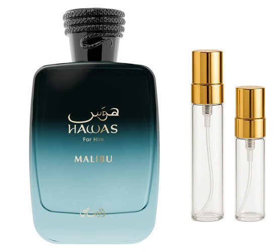 Hawas Malibu de Rasasi es una fragancia de la familia olfativa Aromática para Hombres y Mujeres. Esta fragrancia es nueva. Hawas Malibu se lanzó en 2025. Las Notas de Salida son piña, naranja y toronja (pomelo); las Notas de Corazón son raíz de lirio, ámbar y lavanda; las Notas de Fondo son haba tonka, almizcle, pachulí y cachemira.