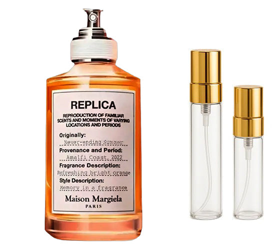 Never-ending Summer de Maison Martin Margiela es una fragancia de la familia olfativa Cítrica Gourmand para Hombres y Mujeres. Esta fragrancia es nueva. Never-ending Summer se lanzó en 2025. Las Notas de Salida son naranja amarga, Aperol y pimienta; las Notas de Corazón son té Earl Grey, cardamomo y nuez moscada; las Notas de Fondo son vetiver, cedro, pachulí, bálsamo del Perú, cachemira y vainilla.