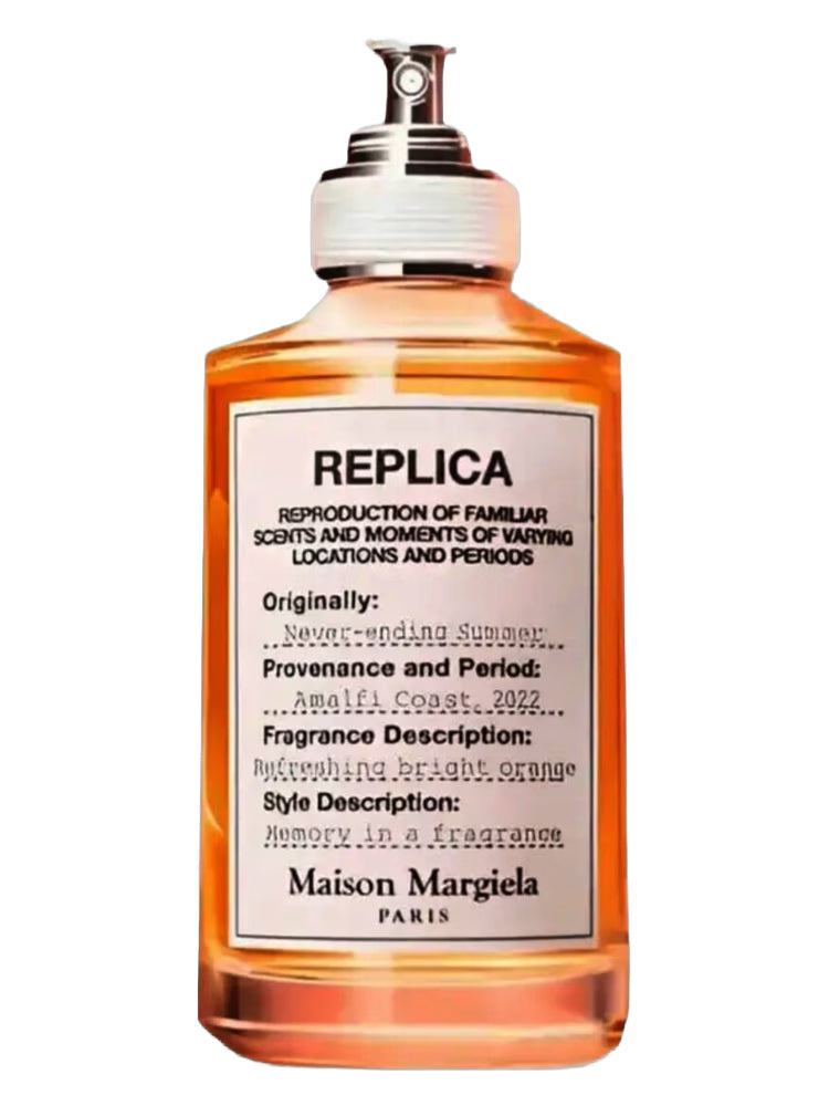 Never-ending Summer de Maison Martin Margiela es una fragancia de la familia olfativa Cítrica Gourmand para Hombres y Mujeres. Esta fragrancia es nueva. Never-ending Summer se lanzó en 2025. Las Notas de Salida son naranja amarga, Aperol y pimienta; las Notas de Corazón son té Earl Grey, cardamomo y nuez moscada; las Notas de Fondo son vetiver, cedro, pachulí, bálsamo del Perú, cachemira y vainilla.